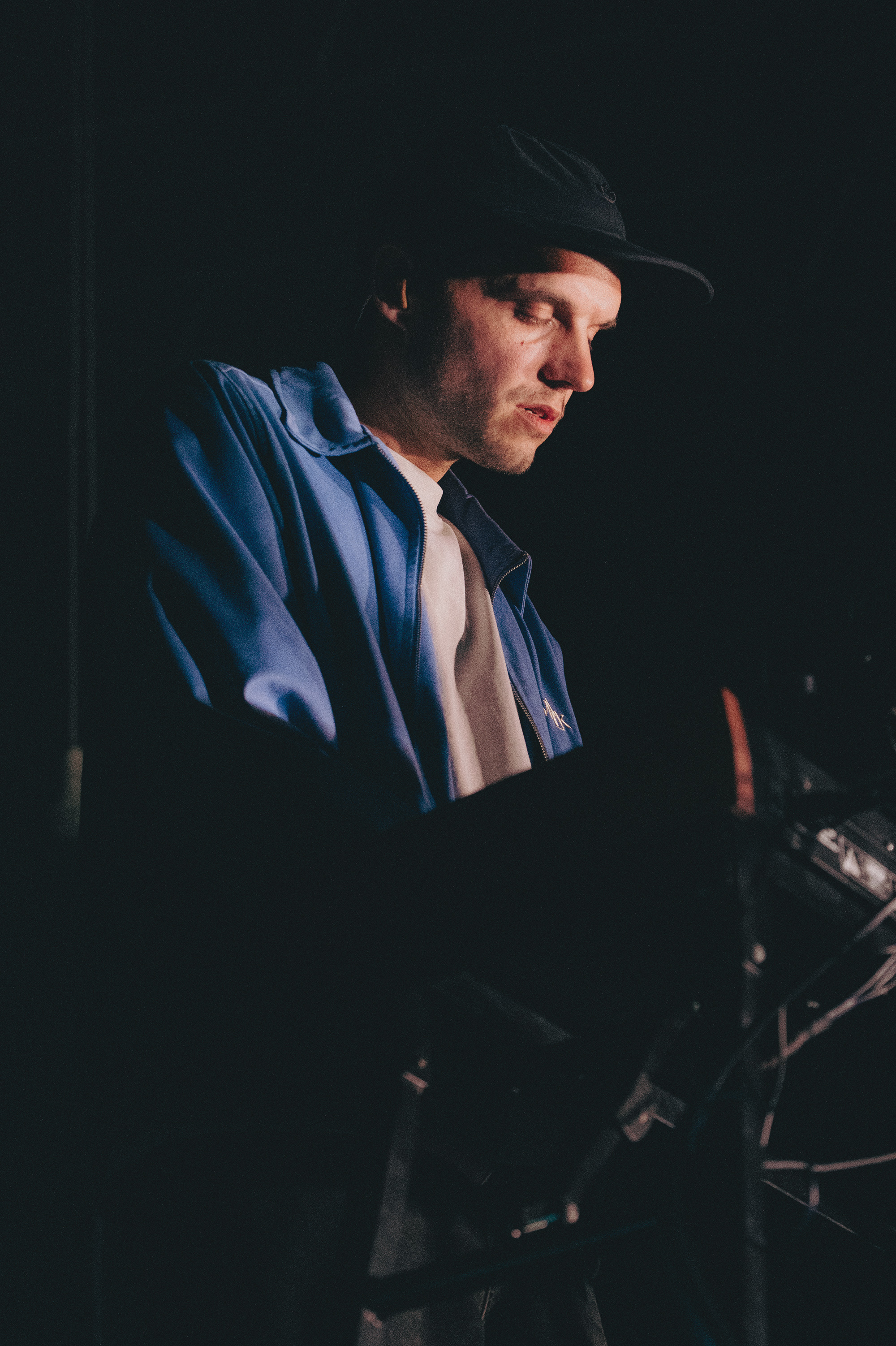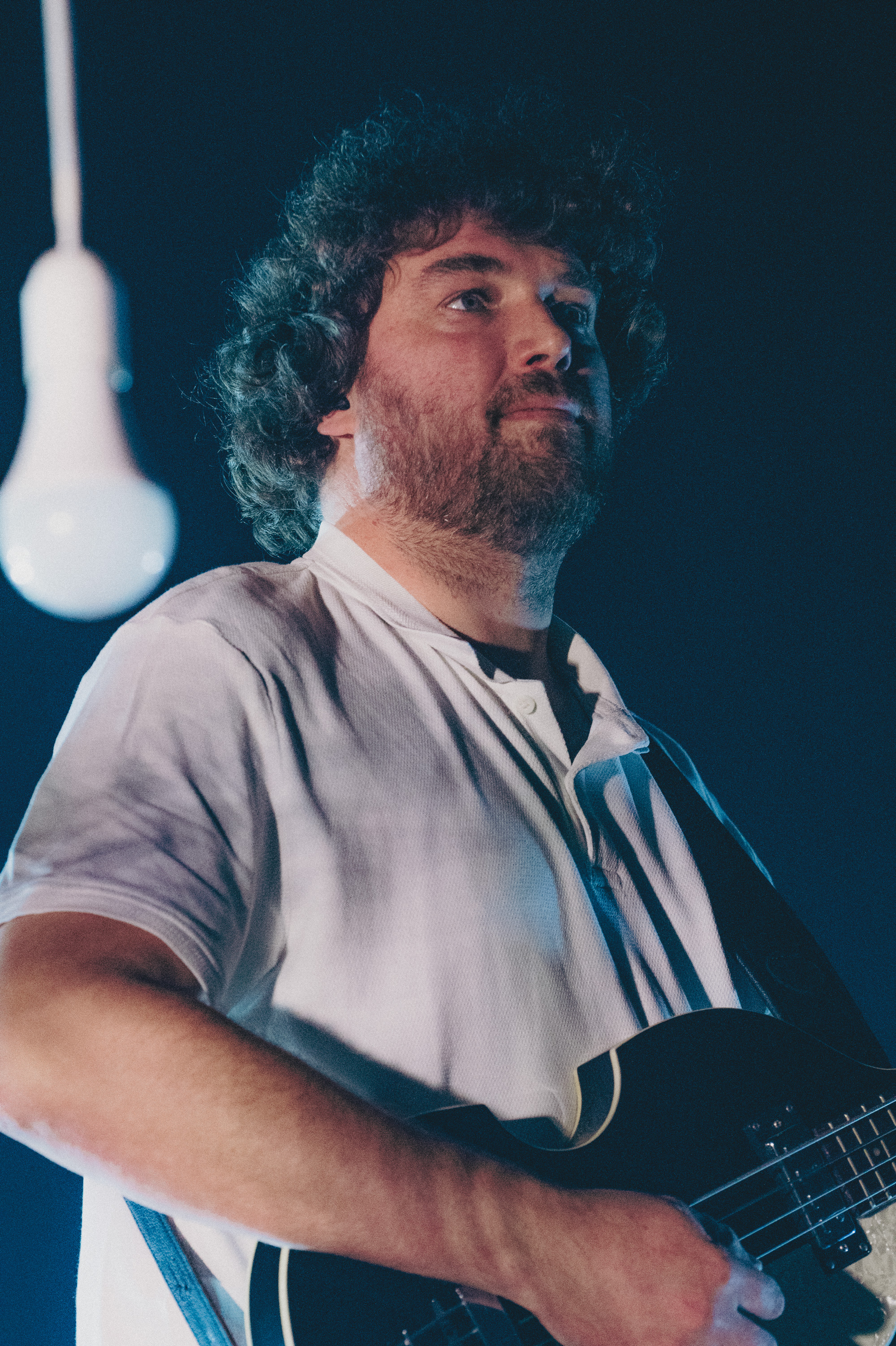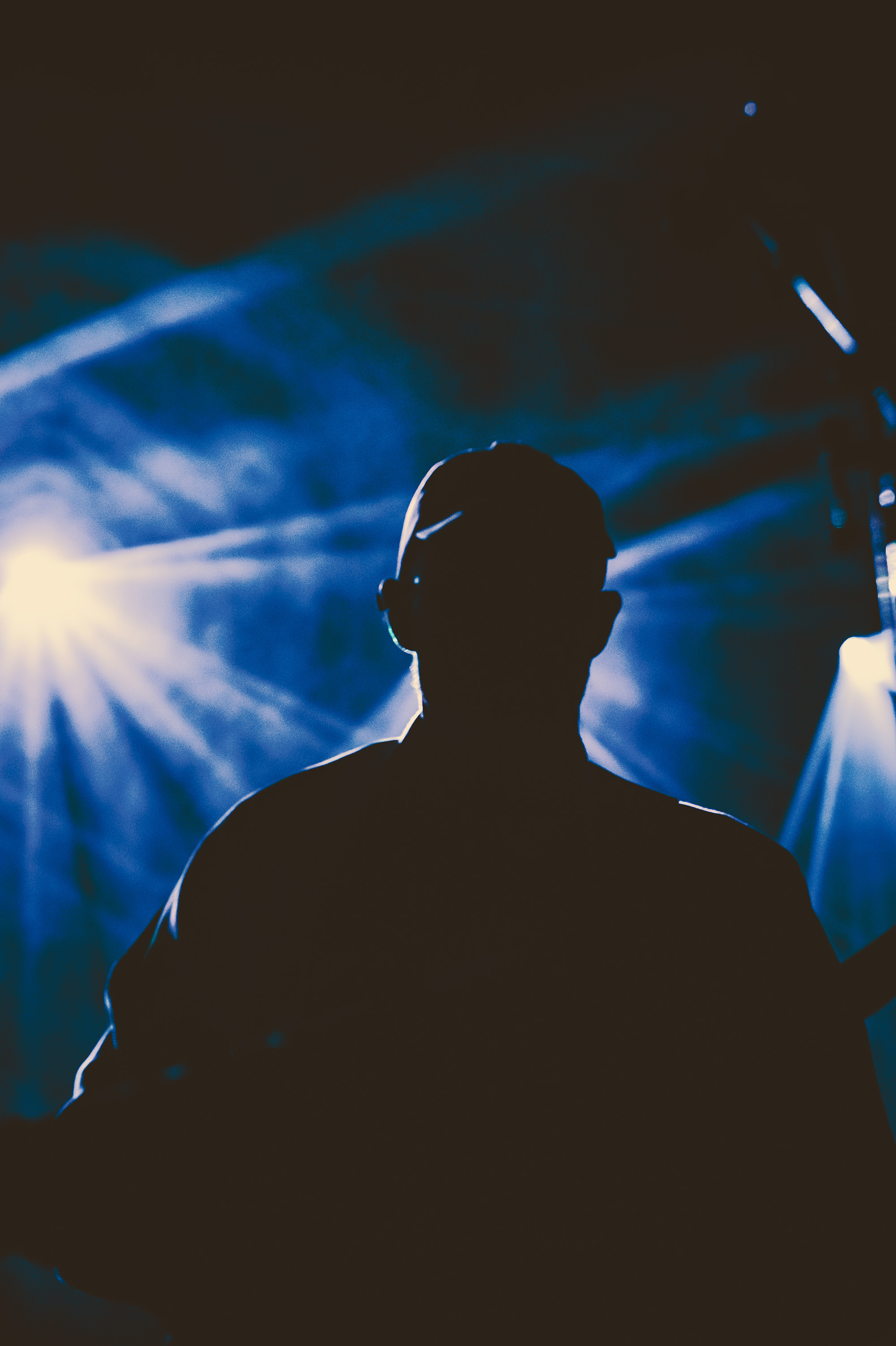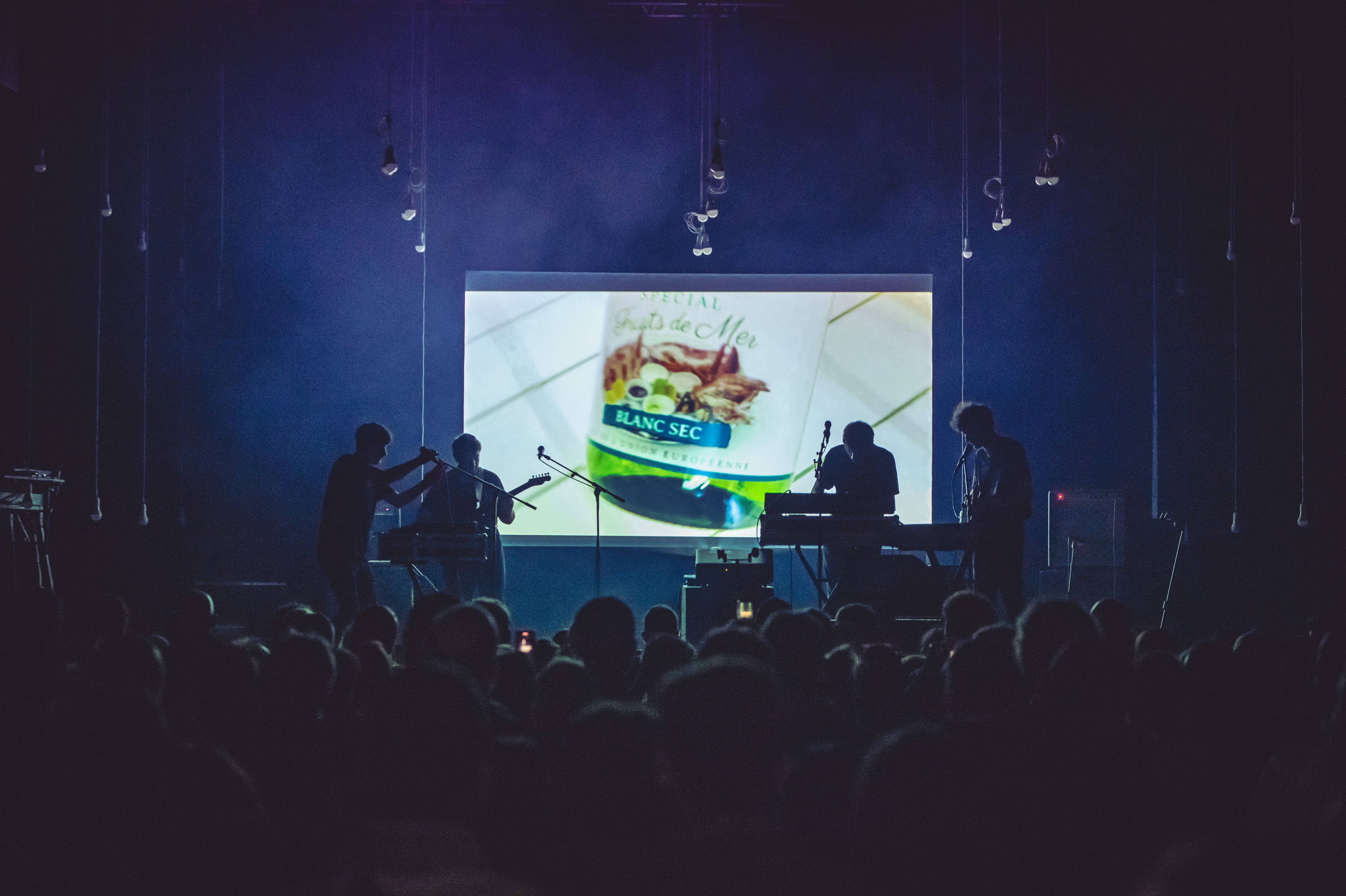 Ambiance de concert garage avec lumière monochrome et stroboscope.